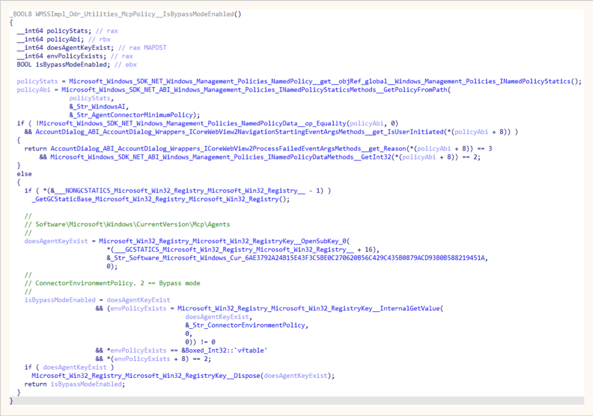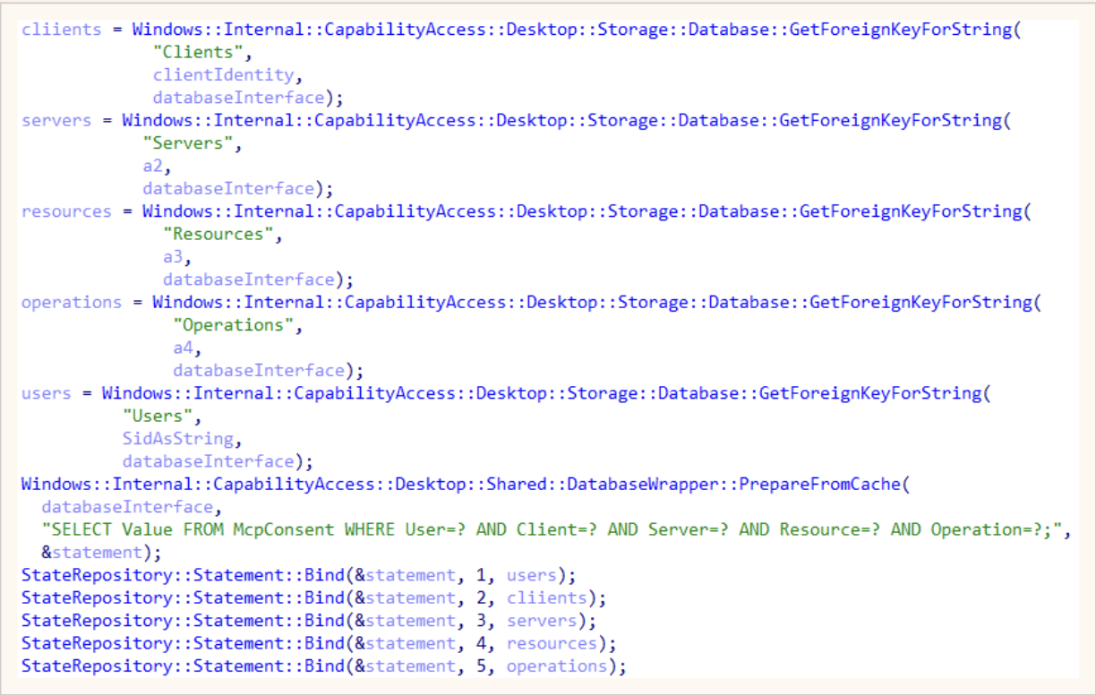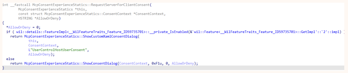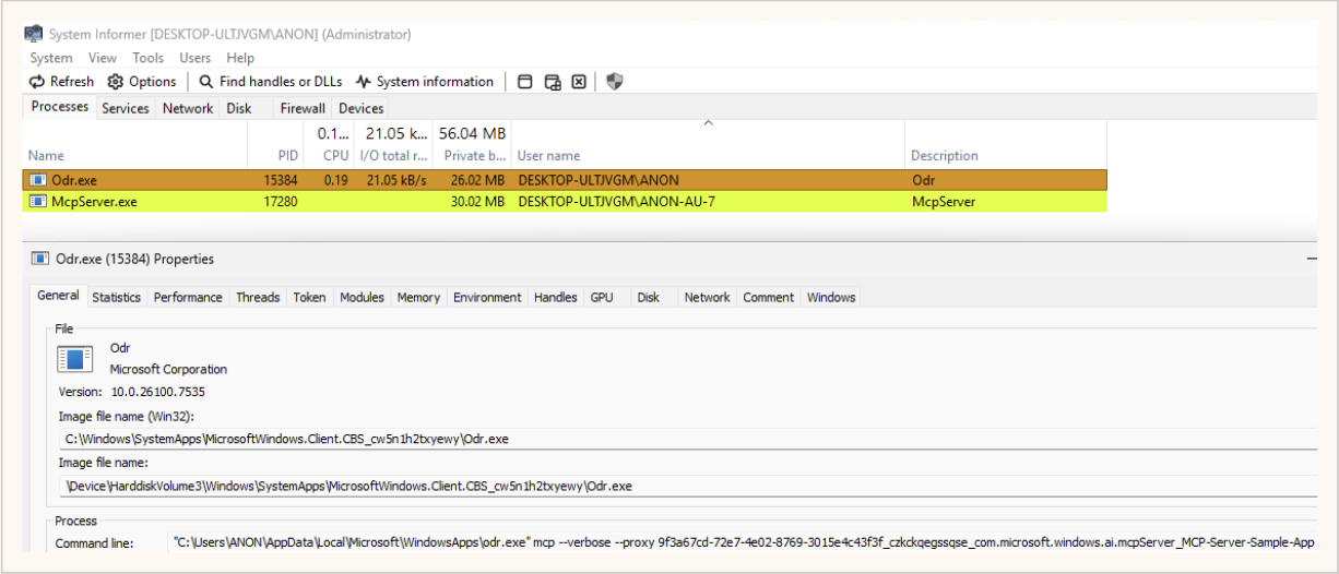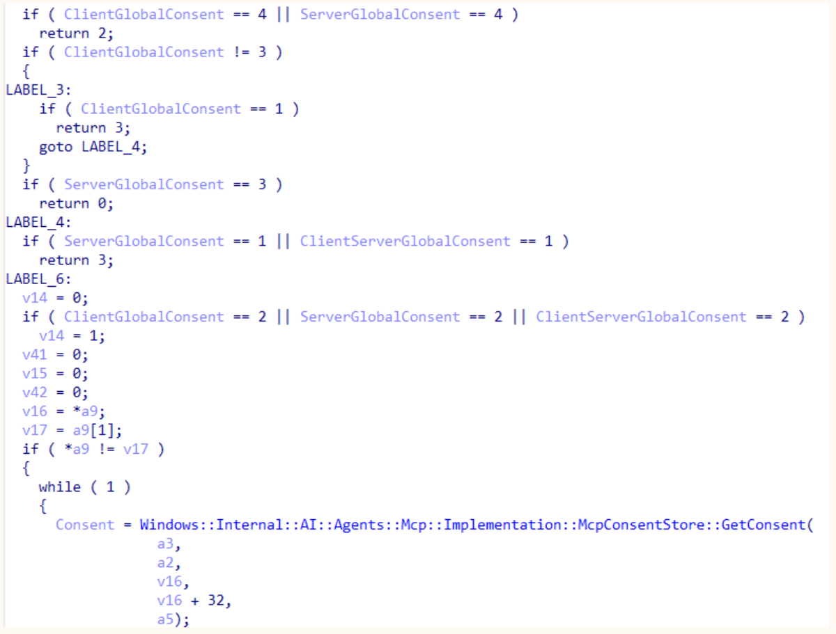 But what actually powers these new features? While Microsoft has published documentation on how to register and use MCP server through ODR, the internal mechanisms: how clients are validated, how consent is managed, and how the system enforces access control, remain largely undocumented. Through reverse engineering of Odr.exe and its associated libraries, the blog post examines the internals of ODR’s MCP infrastructure. We document the new, undocumented COM interfaces (IMcpAccessManagerStatics and IMcpConsentManagerStatics) that govern client and server access, this SQL-backed consent database that persists user decisions, and the ETW telemetry that audits every interaction between MCP clients and servers.