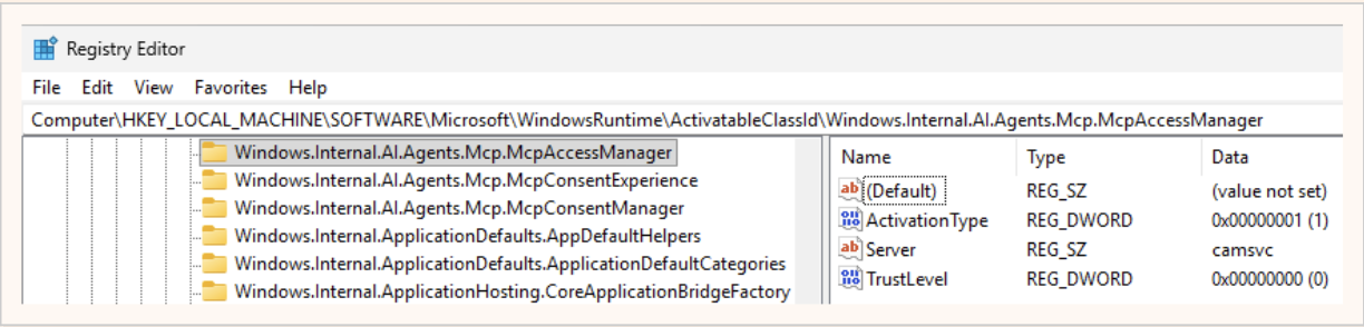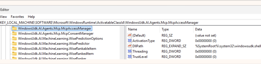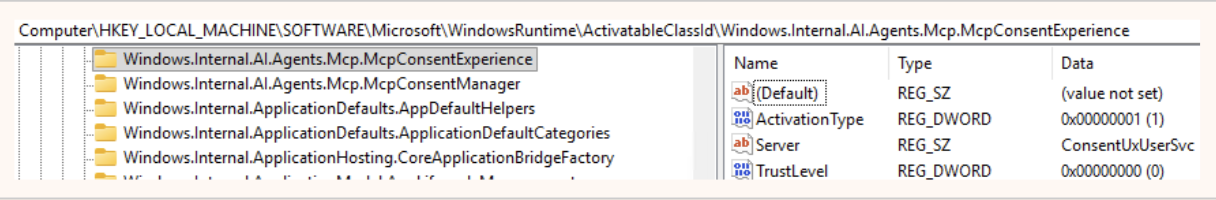 Reverse engineering of this provider’s registration reveals that it’s using the GUID {39C84785-FE74-4601-9E68-408A7EFAB941} and is named Windows-AI-MCP. There are two additional providers: Windows-AI-On-Device-Registry and Windows-AI-Agents, with GUIDs {86BA0849-C1D1-4F2F-9234-503B58EEE0FD} and {8C84D7D1-F1A1-46BD-A753-E865B9B7DA45} respectively.