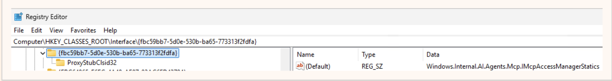 Since we know the location of these manifests, it is trivial for us to aggregate them. However, because ODR relies on package identities for MCP server registration, we can leverage WinRT (an abstraction over COM) to do this for us. WinRT is the implementation Microsoft has for most AI-related code infrastructure, the Insider Preview SDK has many (currently) unimplemented WinRT namespaces, as the DLL in which this code is packaged, Windows.AI.Agents.dll, has not yet shipped on Windows. However, reverse engineering ODR and its associated infrastructure shows that the current COM components, which we will see later in this blog post, are instrumented via WinRT and are not present in the latest Insider Preview SDK (as these interfaces are for internal usage).