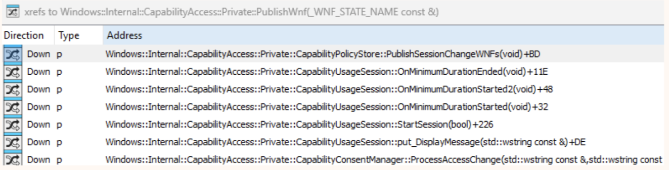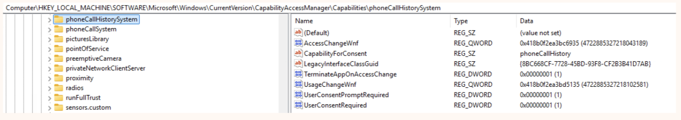 Additionally, each of the Capabilities in the HKEY_LOCAL_MACHINE\SOFTWARE\Microsoft\Windows\CurrentVersion\CapabilityAccessManager\CapabilitiesRegistry key contains the AccessChangeWnf value for which a notification can be published. The AccessChangeWnf contains the WNF_STATE_NAME_INTERNAL state name information to publish the notification to the correct location.