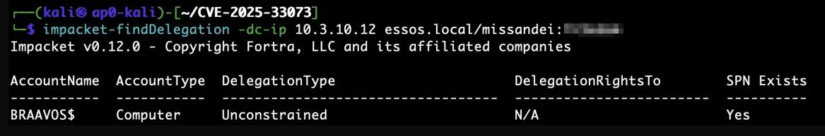 The first step is finding systems with unconstrained delegation that don’t enforce SMB signing. Previously, confirming whether a target was actually patched against a specific CVE required administrative access to the machine. It involved checking installed KBs, reading registry keys, or running vulnerability scanners with elevated credentials. For CVE-2025-33073, Depth Security’s RelayKing[6][7] solves this by querying the Update Build Revision (UBR) from DCERPC, which is accessible with low-privilege domain credentials. This lets you determine whether a host’s patch level predates the June 2025 fix without needing admin on the target. Once a list of these hosts is compiled, we can use findDelegation to find systems configured for unconstrained delegation with an existing SPN.