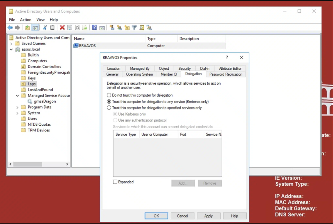 To demonstrate the full path from low-privilege domain user to domain compromise, we used Orange Cyberdefense’s GOAD lab environment[5]. MEEREEN is the domain controller for ESSOS.LOCAL, BRAAVOS is a member server we configured for unconstrained delegation, and we started with credentials for a standard domain user.