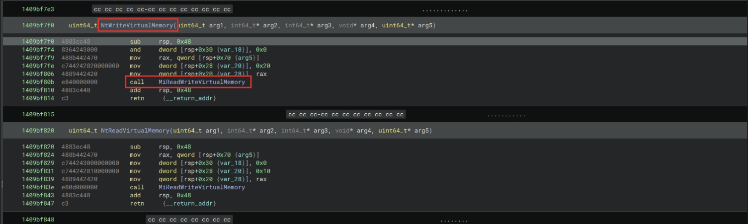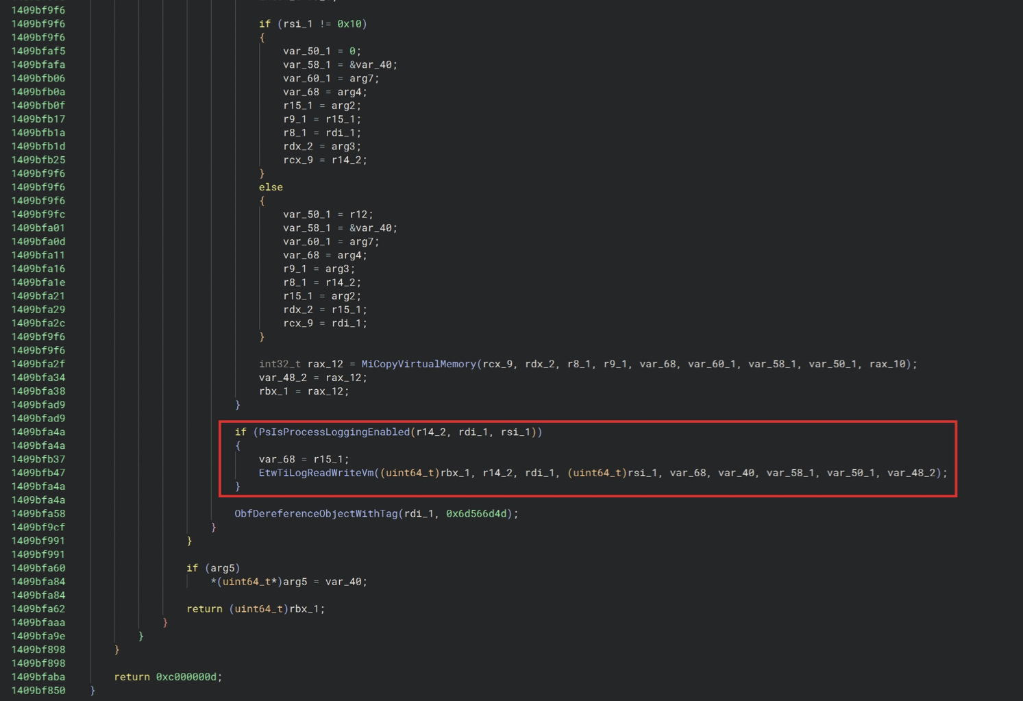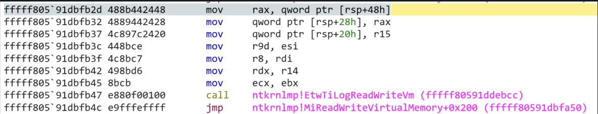 - The ETW:TI branch is followed in the MiReadWriteVirtualMemory function.