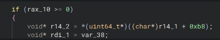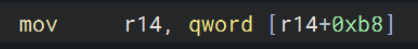 So, looking at this in assembly we can see it is dereferencing whatever is in r14 offset with hex b8 and storing that back in r14.