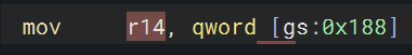 Scrolling up to see what is in r14 in the first place, we find that it is storing whatever is at gs:0x188 – and this is the address of where the CurrentThread information is stored, which is a KTHREAD. How do we know this? Well, you can use the vergiliusproject to traverse from GS > Prcb (offset 0x180) > CurrentThread (offset 0x8).