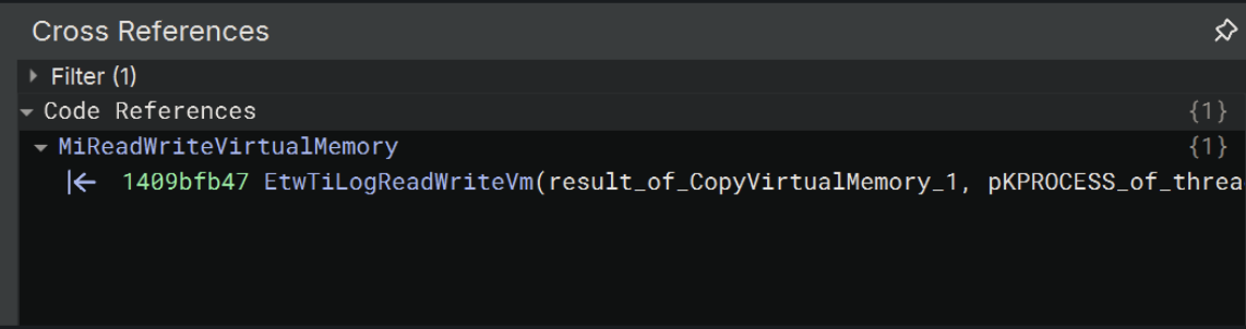 Interestingly EtwTiLogReadWriteVm only has one reference – so clearly there is something special about this function.
