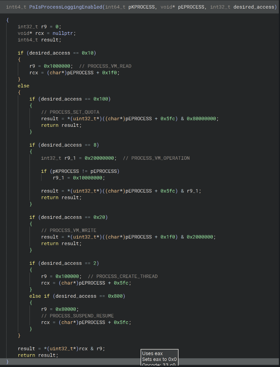 Taking a look inside of PsIsProcessLoggingEnabled we can see (after I’ve mapped the access rights via comments):