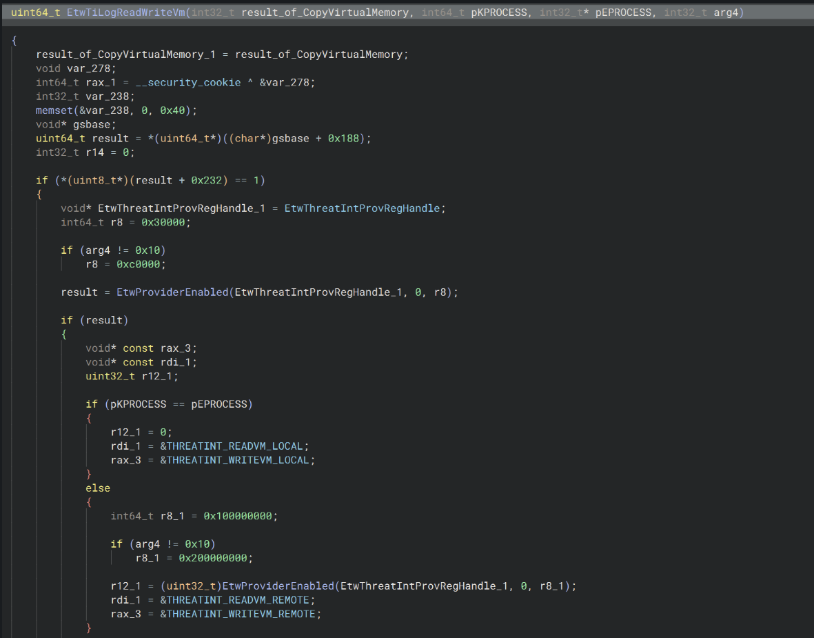 Before we talk about debugging this, lets quickly have a look inside of EtwTiLogReadWriteVm to see what it’s doing – again, we can just use Pseudo C to keep things simple. It’s quite a long function, but looking immediately at the beginning we see: