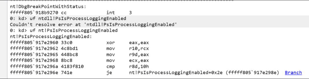 Ok – so we have started the VM with the kernel debugger attached. First things first, lets break the debugger and do a lookup for the function PsIsProcessLoggingEnabled with uf nt!PsIsProcessLoggingEnabled.