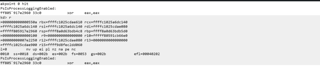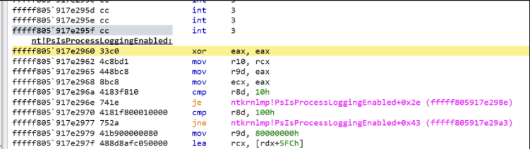 As we can see, the bits are not set! If we step through this in the debugger, after returning from the function PsIsProcessLoggingEnabled, we do a test eax, eax followed by a jne – the address of the jne will branch us to then making the ETW call – thus, from stepping through this, we confirm the hypothesis that the bits are not set. The below image shows us having stepped over the jne instruction.