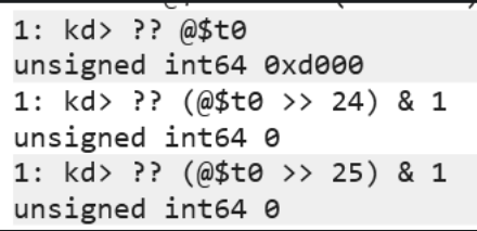 Counting the bits of the ULONG (32 bits), for EnableReadVmLogging and EnableWriteVmLogging, we are looking to see if bits 24 and 25 are set. To do this, we can save the DWORD into a temporary variable in the debugger and do some bit field manipulation to print the result out as follows: