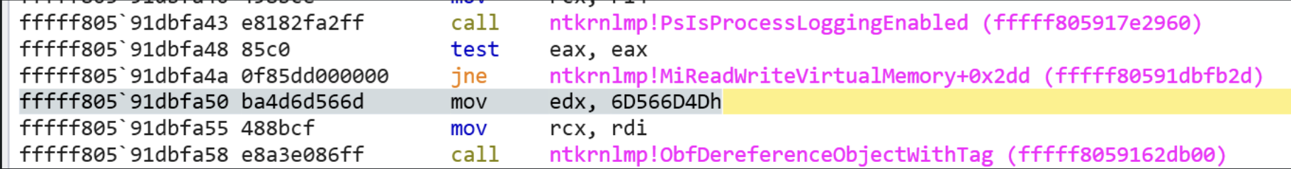 And in there, we have two bit flags for: EnableReadVmLogging and EnableWriteVmLogging – nice! It’s checking to see whether these are set! So, we need to examine whether these bits are set or not in the EPROCESS structure at runtime to see if this is the issue; or if its something else.