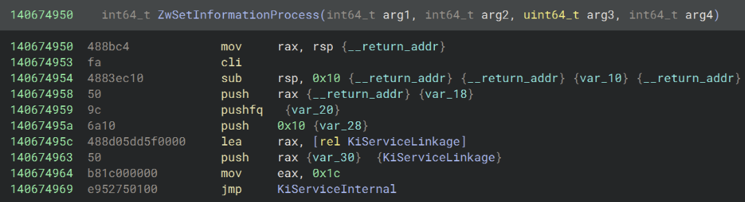 As the ZwSetInformationProcess function isn’t available in the Windows Driver API, but it is available in the .text section of the kernel, we are able to define the function prototype, mark it as unsafe extern “system” and call it directly from our code, over the Foreign Function Interface. So, lets define the function prototype as per ntdocs: