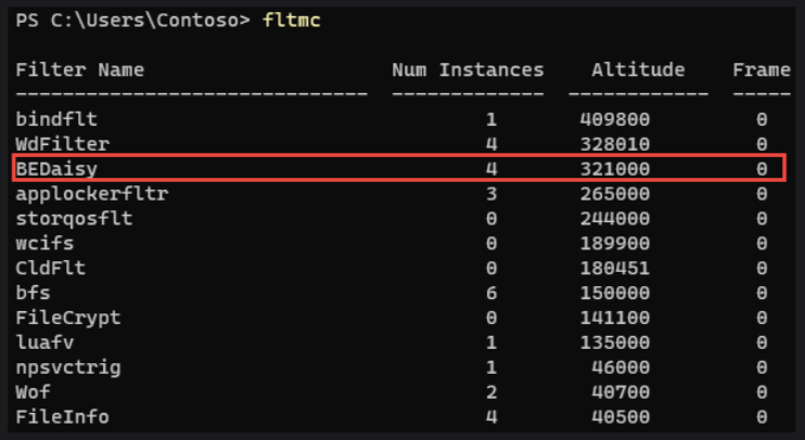 The altitude value determines where BEDaisy sits in the filter stack relative to other minifilter drivers. At altitude 321000, it sits below Windows Defender’s WdFilter (328010) but above most other system filters.