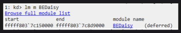 Opening the crash dump in WinDbg, BEDaisy appears in the module list: