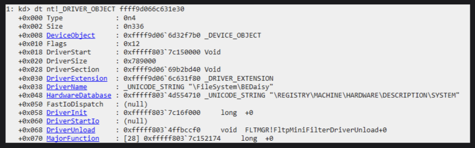 The filter manager stores BEDaisy’s driver object reference. Dumping it: