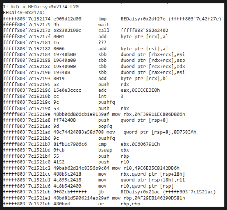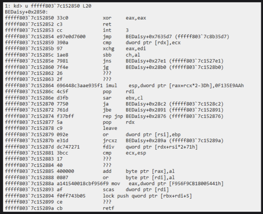 This is not a complete reverse engineering of BEDaisy. The driver is over 7MB of obfuscated code and a full analysis would take weeks or months. What this post covers is the methodology I used to extract and analyze the driver, the protections I encountered, and the specific findings I was able to recover. If something is wrong or incomplete, that is expected given the scope, and I welcome corrections.