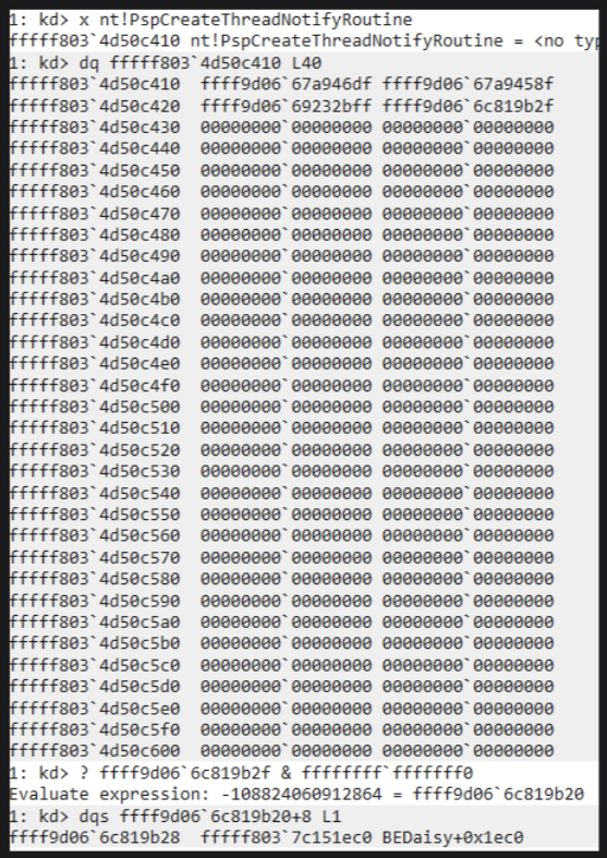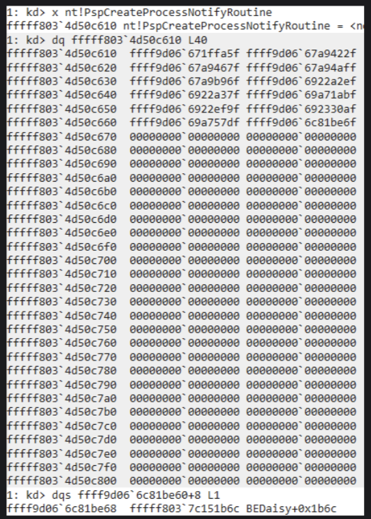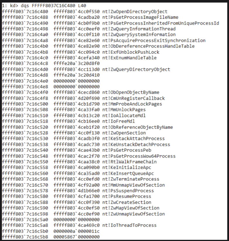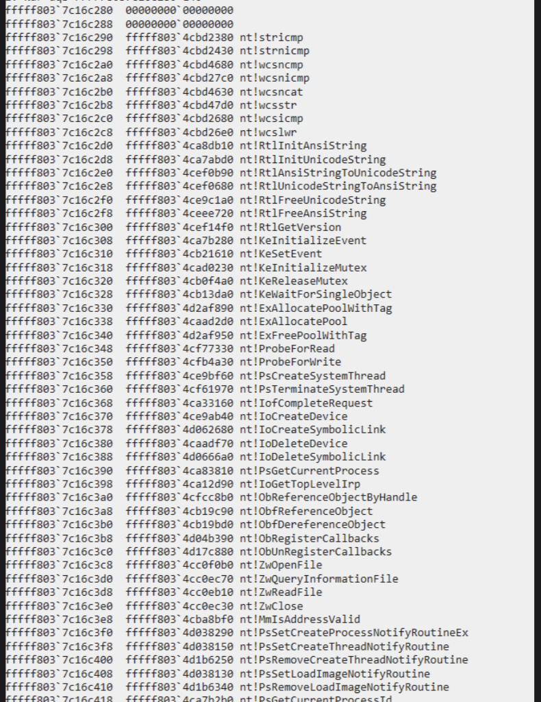 Dumping the table from the crash dump with dqs (which resolves addresses to symbol names) reveals the complete set of kernel APIs that BEDaisy uses: