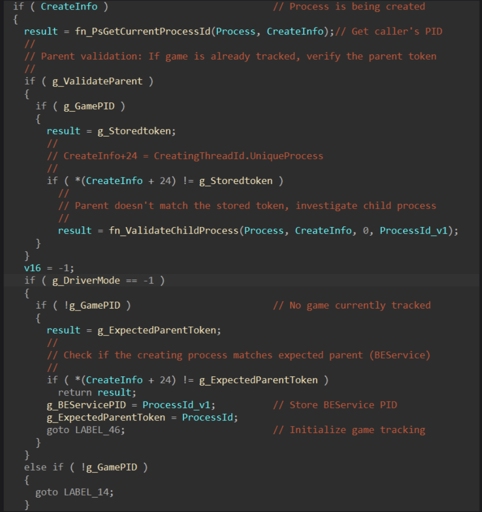 The initialization block (LABEL_46) runs when a new game process is first detected. It sets g_IsTrackingActiveto 1, stores the new process ID and parent process ID, copies the 128-bit creator token from CreateInfo+24 into g_StoredToken, and resets roughly a dozen state variables to zero. These variables correspond to the various scanning and monitoring subsystems that BEDaisy runs while the game is active. Setting byte_FFFFF8037C16C175to 1 at the end signals that initialization is complete. Below that, LABEL_14 is the fallback path for non-first-launch mode: it checks whether the creating process matches BEService before proceeding to name matching.
