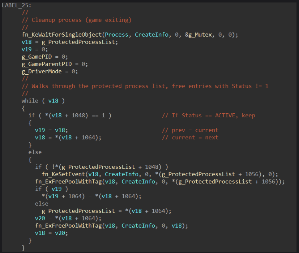 The cleanup path (LABEL_25) executes when the game process exits. It acquires a mutex via fn_KeWaitForSingleObject, then walks the first of two singly-linked lists. g_ProtectedProcessList contains entries with a status field at offset 1048, an object reference at offset 1056, and a next pointer at offset 1064. Entries with status equal to 1 (active) are kept. Inactive entries have their events signaled via fn_KeSetEvent and their memory freed via fn_ExFreePoolWithTag. The node itself is then unlinked and freed.