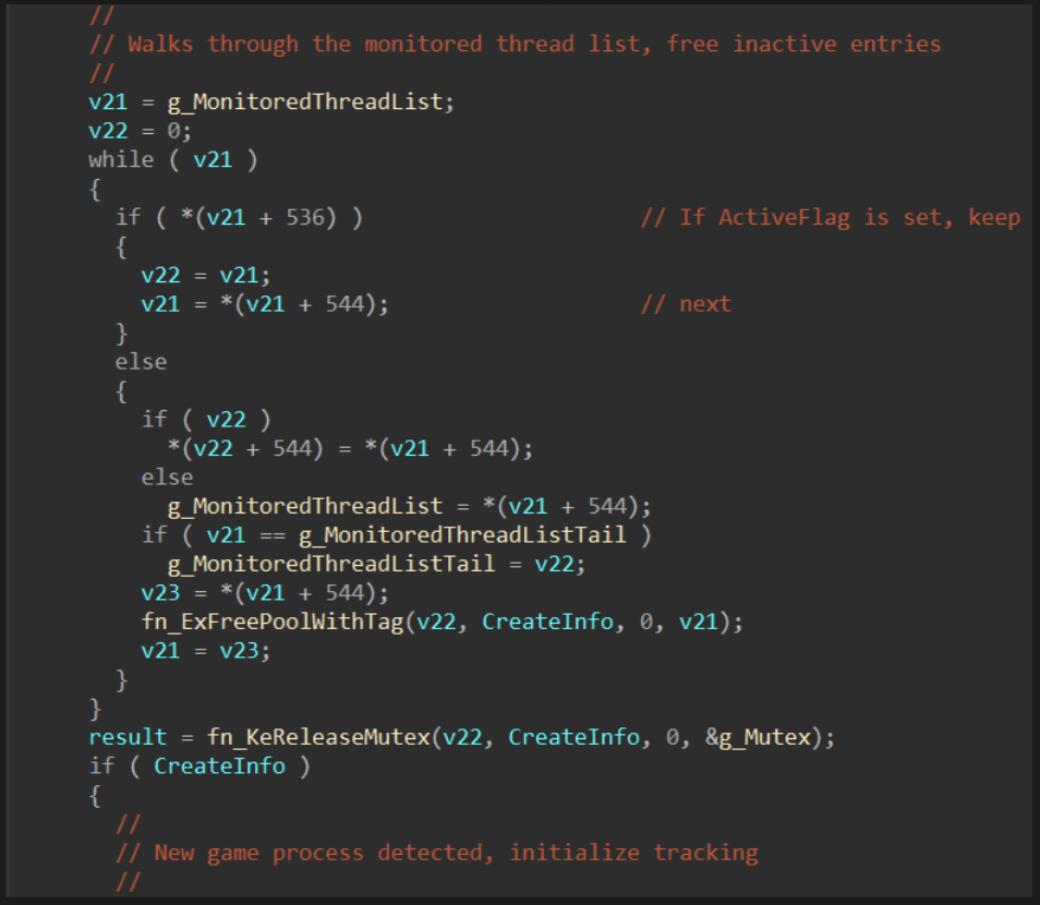 The second linked list (g_MonitoredThreadList) follows a similar pattern with an active flag at offset 536 and a next pointer at offset 544. This list also maintains a tail pointer (g_MonitoredThreadListTail) that is updated when the tail entry is removed. After both lists are cleaned, the mutex is released with fn_KeReleaseMutex, and all tracking state is zeroed.