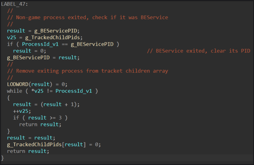 The process exit path (when CreateInfo is null) is the simplest part. If the exiting process is the game (_RCX == g_GamePID), it jumps to the cleanup block described above. Otherwise, it checks whether the exiting process was BEService and clears g_BEServicePID if so. It also walks a small array of three tracked child PIDs and clears any matching entry.