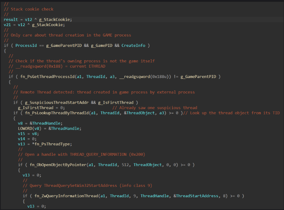 The function begins with a stack cookie check (v12 ^ g_StackCookie), which the process callback did not have. This is likely because the thread callback uses local stack buffers for the thread handle and start address, while the process callback operates mostly on globals.