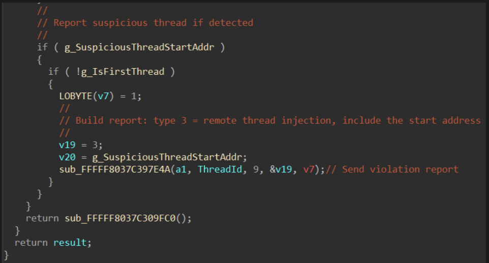 After releasing the mutex and cleaning up the thread handle (fn_ZwClose) and object reference (fn_ObfDereferenceObject), the callback checks whether a violation should be reported. If g_SuspiciousThreadStartAddr is set and g_IsFirstThread is false (meaning this is not the first suspicious thread), it builds a small report structure on the stack: v19 = 3 is the violation type (remote thread injection) and v20 = g_SuspiciousThreadStartAddr is the offending address. This is passed to sub_FFFFF8037C397E4A, the violation reporting function that sends the detection to BEService through the IOCTL channel. That function could not be decompiled due to stack frame obfuscation caused by the heavy junk instruction preamble, but its role is clear from context.