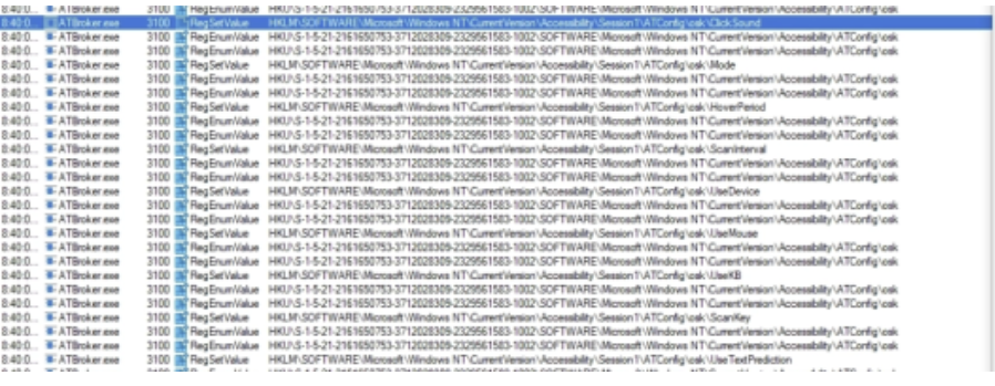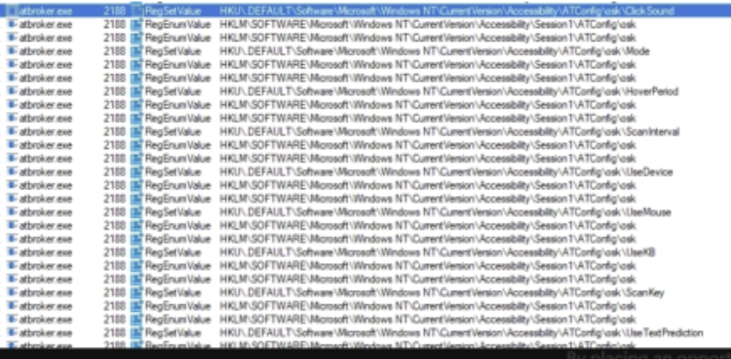 The ATbroker.exe process running as the SYSTEM account will proceed to copy values from HKLM\SOFTWARE\Microsoft\Windows NT\CurrentVersion\Accessibility\Session1\ATConfig\osk