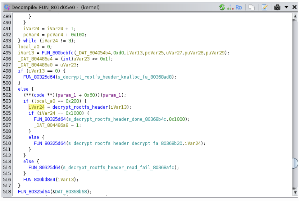 We have a string to look for (decrypt_rootfs_header) and a valid kernel image for which we know the load address (0x80010000). It’s just a matter of loading it into Ghidra with the right architecture (MIPS:LE:32) and load address. I know about vmlinux-to-elf, it just don’t always work.