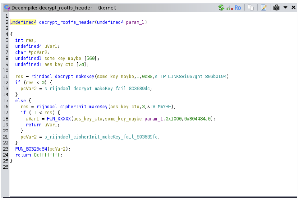I’ll spare the details but basically the first 512 bytes of the rootfs are encrypted using AES-128-CFB1 with a key and IV hardcoded in the kernel.
