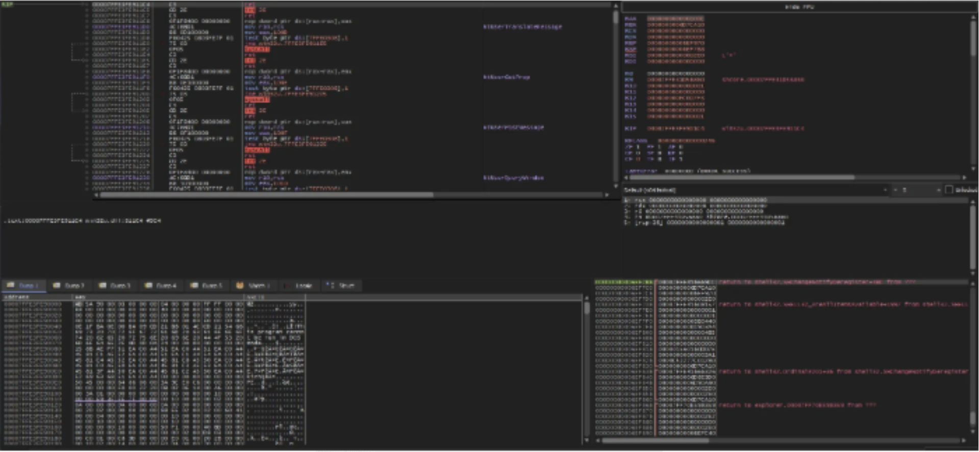 The first image shows what the thread looked like before we made any changes to the context. At this point, the thread is paused and its registers and stack are left untouched. The instruction pointer (RIP) is pointing to where the code was originally executed, and the stack pointer (RSP) is managing the current call stack.