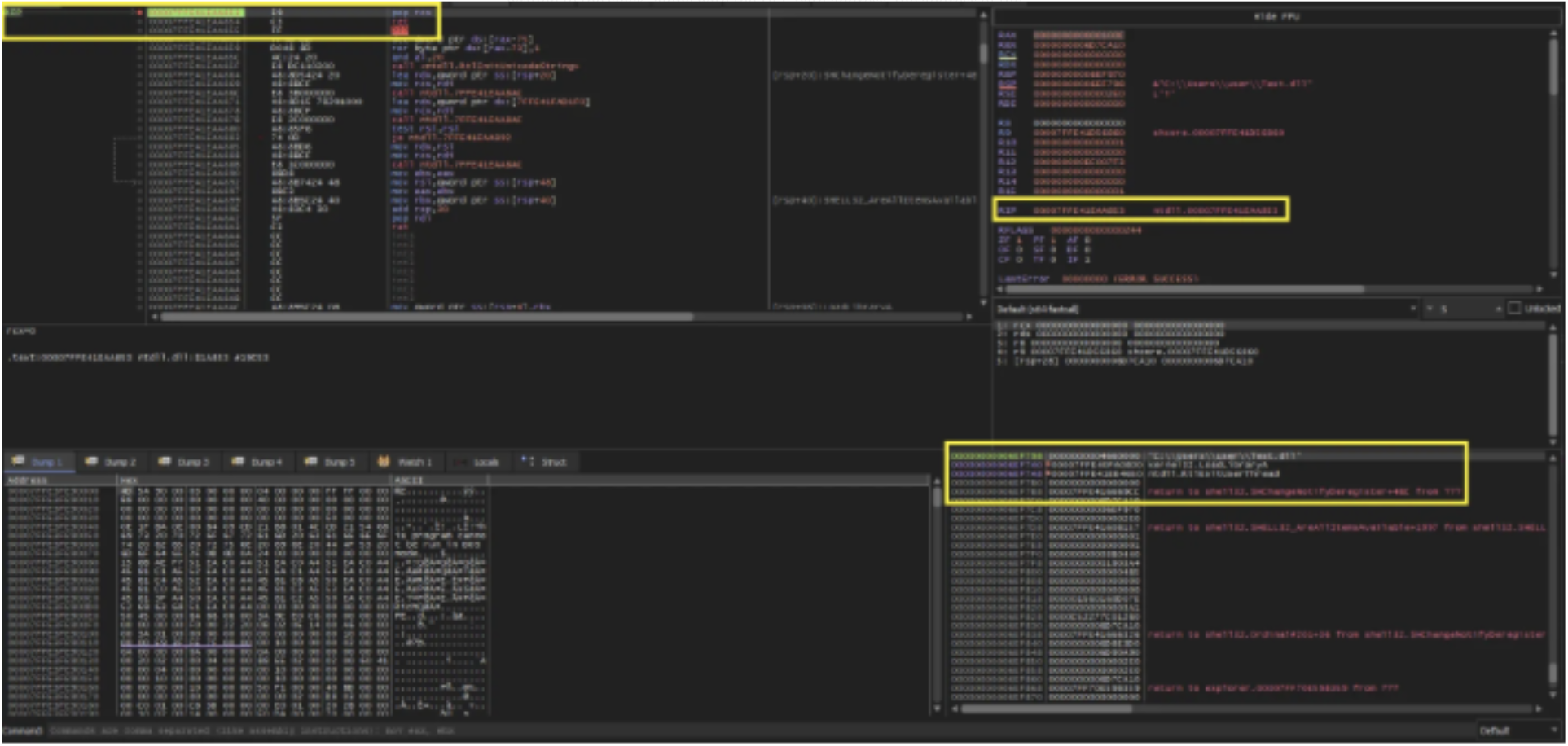 The second image shows what happens to the thread after the context has been modified. At this point, the instruction pointer (RIP) has been updated to point to our ROP gadget (pop rcx; ret), and the stack pointer (RSP) has been adjusted to allocate space for the prepared buffer. The buffer has been written to the stack, along with the DLL path address, the address of the ‘LoadLibraryA’ function, and the return address pointing to ‘ExitThread’.
