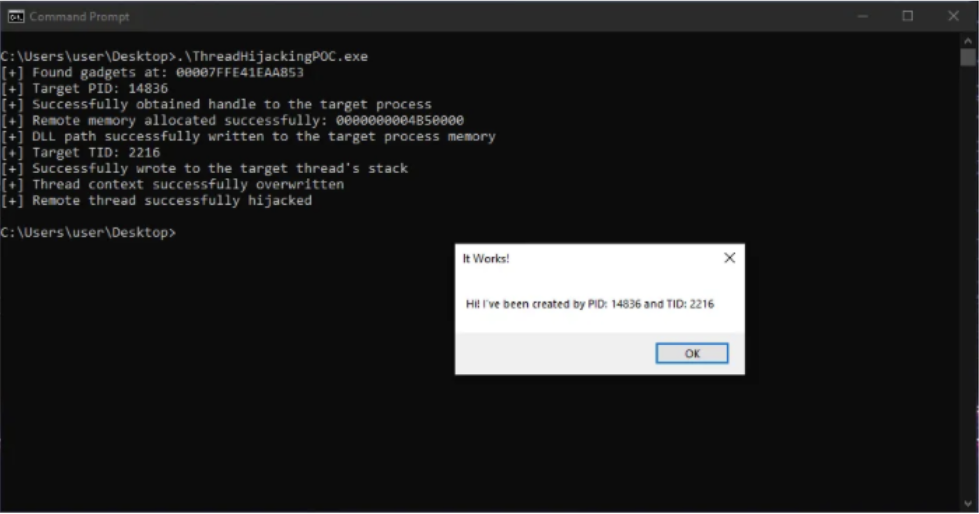 printf("[+] Successfully wrote to the target thread's stack\n");