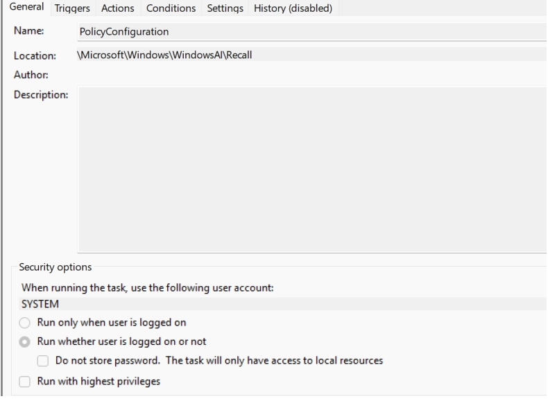 <URI>\Microsoft\Windows\WindowsAI\Recall\PolicyConfiguration</URI>