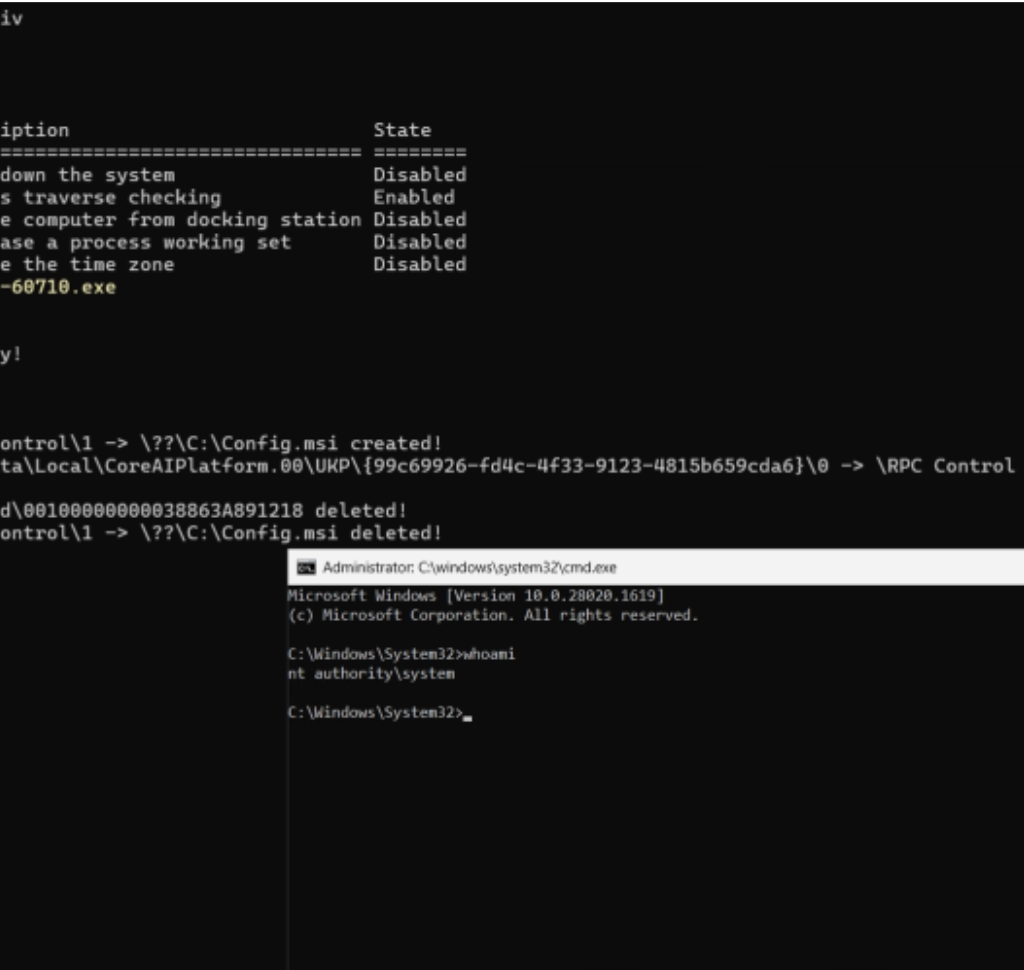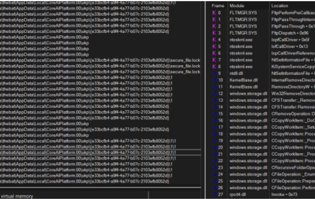 Once the secure_file.lock file is created a function will return and it will continue to clean up the directory using the old TryDeleteUniqueDirectory function. This is where an issue arises with the patch, while they managed to protect the “unique” directory, any sub-directory is unprotected. The IFileOperation::DeleteItem used by TryDeleteUniqueDirectory will perform recursive deletion by default, this allows us to bypass the patch by just creating additional sub-directories inside the %USERPROFILE%\AppData\Local\CoreAIPlatform.00\UKP\<GUID> directory.