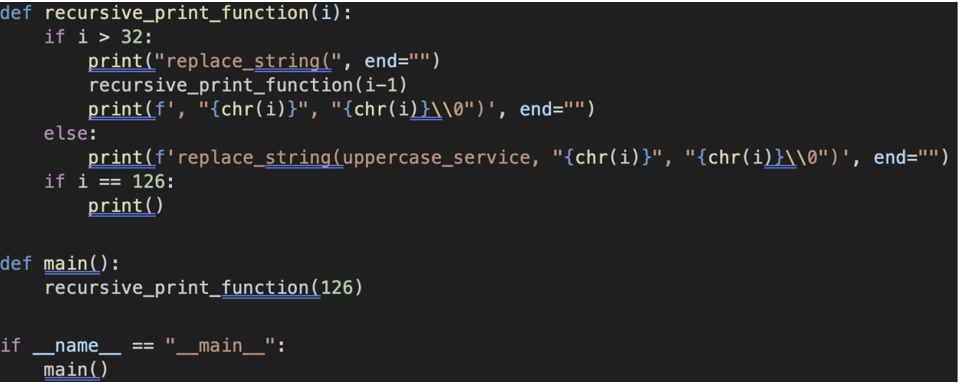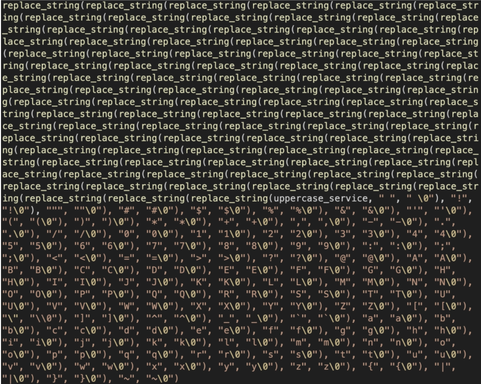 Unfortunately, replace_regex() identifies capturing groups using the syntax “\X” where X is the number of the capturing group, i.e. capturing group 1 is “\1”. This directly conflicts with the regex null character, which is \0. As a result, it’s not possible to use replace_regex() to automatically add a 0x00 byte after every character, and instead a manual replace must be done for every possible character one by one using replace_string().