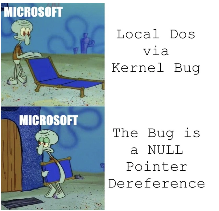 Despite the stability of the PoC, Microsoft has classified this as Moderate severity, as they do not consider NULL pointer dereferences to be viable Elevation of Privilege (EoP) vectors in modern environments. Microsoft specifically notes that “NULL remapping cannot be exploited in Windows 8+” due to the kernel-mode prevention of mapping the zero page (address 0). Consequently, while the DoS is absolute, the risk of code execution is mitigated by the OS: