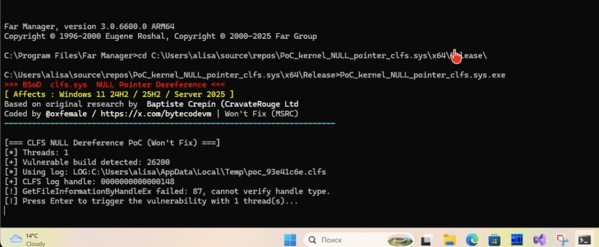 ( I’m rewrite original PoC and add some futures + support windows ARM https://github.com/oxfemale/PoC_kernel_NULL_pointer_clfs.sys)