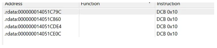 To get to this structure we need to search for this RVA via Search -> Sequence of Bytes… in IDA. This will return 4 results: