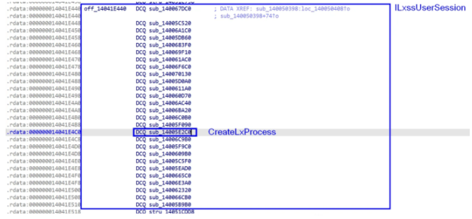 Note: It was a little difficult to validate that ILxssUserSession was the primary interface without symbols, especially because the public IDL defines 23 custom methods (26 total including 3 inherited from IUnknown), but the vtable in wslservice.exe holds 27 entries — one extra slot not in the public IDL. I also had to validate that vtable slot 16 (0-indexed) held the CreateLxProcess method by reversing and following the code flow