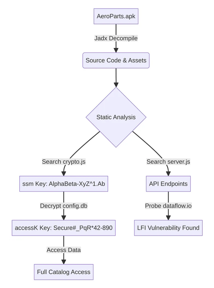 This document provides a detailed, anonymized walkthrough of the process used to analyze the “AeroParts” mobile application. It covers everything from initial decompilation to the discovery of hardcoded keys and a critical Local File Inclusion (LFI) vulnerability.