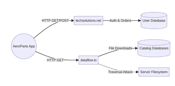 The endpoint `dataflow.io/fetchFile` immediately caught our attention. It appeared to take a file path as a parameter to serve downloads. We tested this for a **Local File Inclusion (LFI)** vulnerability, which occurs when an application uses user-supplied input to access files without properly restricting the path.