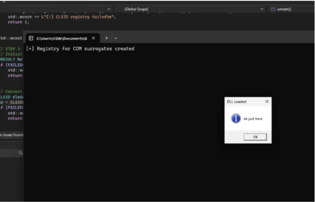 Finally, we call CoCreateInstance with the flag CLSCTX_LOCAL_SERVER. This flag is the detonator. It forces Windows to treat our COM object as an out-of-process server, which causes the COM Service Control Manager to read our registry entries, find the DllSurrogate value, launch dllhost.exe, and load our DLL into it. Our job is done.